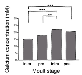 Like other crustaceans, isopods grow by periodic casting off of their exoskeletons in a process known as moulting. After the old exoskeleton is shed, the new soft cuticle is expanded to a larger size by hemolymph pressure from within. Over the next few days the new cuticle is strengthened and hardened by influx of calcium salts and other materials. In aquatic and semiterrestrial isopods the calcium may be obtained from abundant supplies in seawater, but in fully terrestrial species availability of calcium is limited to that found in soil and herbaceous foods. Calcium present in the old exoskeleton is therefore precious and must be salvaged. Moulting in most or all isopods is biphasic, with the posterior half being shed first, followed a day or so later (the intramoult period) by the anterior half (Fig. 1). During premoult of the posterior exoskeleton, calcium is resorbed and moved to the first four sternites of the thorax where it is temporarily sequestered in the form CaCO3 spherules. This stored calcium is later mobilised to harden up both the newly forming posterior exoskeleton and later the anterior exoskeleton. After a short period the same process occurs with the anterior half. During the resorption process the calcium-ion content of the hemolymph increases by 40 - 50% and this, combined with a smaller increase in potassium content, draws water in osmotically. The expanded hemolymph volume inflates the new, soft cuticle, and this expansion after hardening accommodates later tissue growth. After the anterior moult is completed the animal enters the intermoult phase. Length of intermoult is shorter in juvenile stage than in adult stage, where it may occur only once per year. Growth in all crustaceans is therefore a stepwise process.