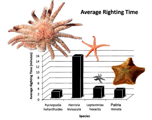 Fig. 1. Righting times for a variety of sea stars. Times are measured in seconds, rather fussily; minutes would have been more informative. Photos are not in scale