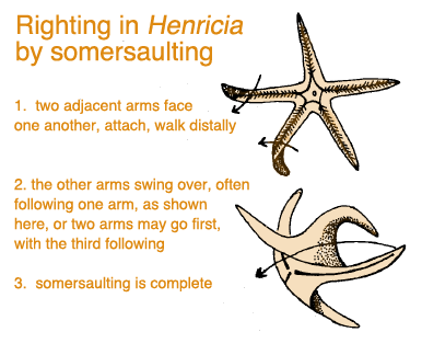 When a sea star finds itself on its aboral surface, that is, upside-down, it endeavours to right itself. Righting has obvious survival value in conditions of rough water and/or shifting substrata, and likely also in protection from predation. The mechanism and behaviour of righting is considered here.