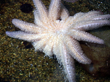 Other west coast somersaulters are Pisaster ochraceus and Patiria miniata, while folding-over is also used by Pycnopodia helianthoides. Figs 1 - 4 show a juvenile P. helianthoides righting itself apparently by the folding-over method, although for a multi-armed species it is hard to see the difference between folding-over and somersaulting.