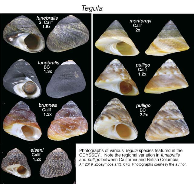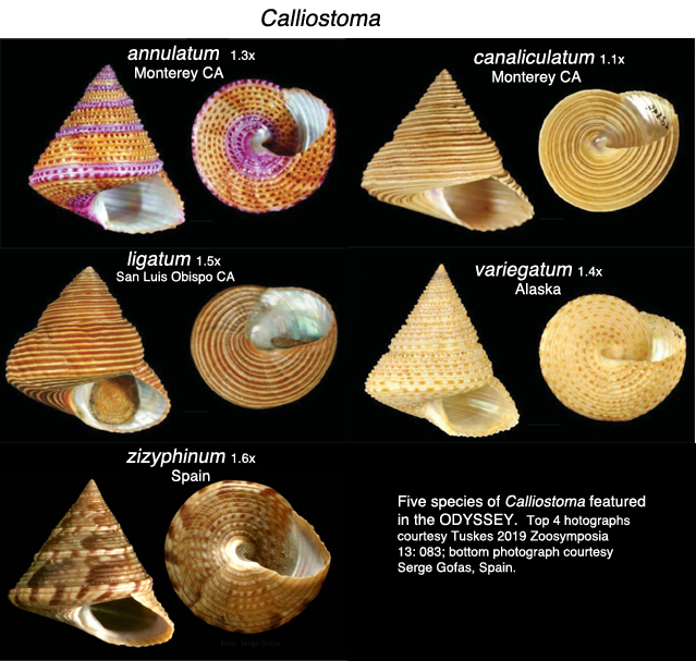 The trochid snail genus Calliostoma is a most successful group of marine snails. There are lierally hundreds of species spread through the world's oceans, with 15 species in southern California alone, many of which are also found throughout more northerly regions and also some in southerly coastal regions. Most or all species are primarily sublittoral, with only a handful also being intertidal. Two researchers in the San Diego area with research ties to the University of California, Davis, and several Californian and other North American Museums have produced a fine display of these 15 species, with up-to-date species name-designations (Figs. 1 - 3)