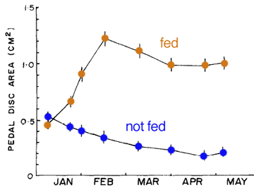 A detailed laboratory study on three species of Metridium by a researcher at Bodega Marine Laboratory, California provides comparative information on maximum size attained and asexual reproductive proficiency. Metridium exilis is a small intertidal species (typically 0.2cm2 pedal disc area) that reproduces asexually by binary fission (longitudinal fission). An ad libitum diet of adult brine shimps increases the rate of asexual reproduction, but has only a small effect on maximum size (1.2cm2; Fig. 1). The author notes that sexual reproduction in M. exilis may be quite