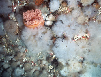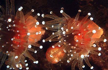 Some sea-anemone species, such as Metridium senile (Fig. 1) reproduce asexually by leaving bits of themselves around to grow into fully functional individuals (Figs. 2 - 4). The offspring are genetic clones of the adult. Sometimes, it seems as if the basal disc (pedal area) simply gets snagged on something or possibly a portion of it is released through contraction of pedal musculature.