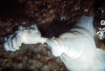 In temperate latitudes the sea anemone Urticina crassicornis (Fig. 1) reproduces sexually by releasing gametes that fertilise externally, leading to a planula larva and to later settlement and metamorphosis. Recently, however, a group of Polish and Russian scientists believe they have identified aggregations of this species in intertidal zones of the Barents Sea that appear to originate asexually from a few large brooding females. The authors point to colour-pattern similarity among members of an aggregation, a size gradation from small to large at increasing distance from the purported large brooders, and observations of juvenile anemones both within the coelenteron (gastrovascular cavity) and appearing on the outer column of these same adults after emergence from their mouths (Figs. 2 - 3). The authors additionally point to the possibility that the monochromatic aggregations result from asexual reproduction, but how and where this might occur are not specified. These would be fascinating findings were it not for the absence of corroborative molecular or other evidence to support the assertion that the species in question is, indeed, U. crassicornis and not another species . This should be a good follow-up research project for the authors.