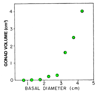 The fission leaves a scar of connective tissue on Anthopleura elegantissima that can be recognised for 2 - 6mo and thus provides an historical record of the occurrence of the process in a population (Fig 1). Additionally, frequency of division in a population is positively correlated with a seasonal decrease of basal diameter. In San Juan Island, Washington, for example, monitoring of these parameters shows that asexual division is least common during spring and early summer when the anemones are rapidly growing, and most common from late summer through the winter, when they are growing only slowly.