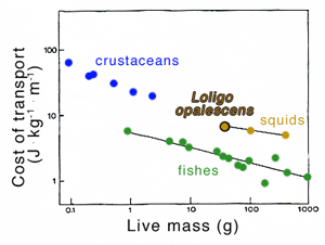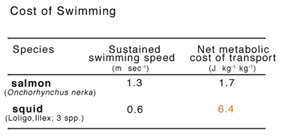 Squids locomote by a combination of finning and jetting, and open-water species can maintain a pace of 1 - 2km • h-1 for weeks at a time. During fast jetting the fins are rolled up to reduce drag. How does the jet-propulsion swimming of a squid compare with tail-wagging swimming of a fish? Acually, not well. A squid uses over three times as much energy to travel half as fast as a sockeye salmon of comparable size (Fig. 1). Fig. 2 shows the net cost of transport for various tail-wagging fishes, including sockeye salmon, in comparison with several species of planktonic crustaceans and three species of squids. The authors note the one advantage of squids over fishes in this regard is that the jet system automatically increases water flow over the ctenidia as swimming speed increases. Fishes expend increasing amounts of energy to ventilate their gills with increased velocity.