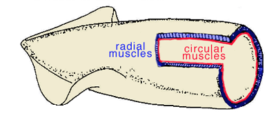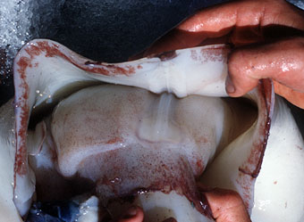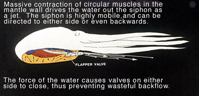 Water flow through a squid functions both for gas exchange and jetting locomotion. Studies on the pelagic squid Doryteuthis opalescens (Fig. 1) at the University of British Columbia indicate a different pattern for each function. During escape jetting, for example, there are three phases: 1) filling of the mantle cavity powered largely by elastic recoil of the mantle wall from the previous jetting, with a small contribution from the radial muscles, 2) hyperinflation of the mantle cavity through contraction of radial muscles drawing more water in, and 3) expulsion of the water powered by contraction of circular muscles. Hyperinflation serves to fill the mantle cavity maximally, making the jet more powerful. In comparison, the more gentle pulsation of gas exchange is done in two ways, either by radial-muscle power or circular-muscle power, but both being antagonised by mantle tissue elasticity (Fig. 2). The study emphasises the important role played by storage of elastic energy in the connective tissue-fibers of the mantle wall in both locomotion and gas exchange (for accounts of temperature-compensation effects and prey-capture experience on escape jetting in squids Doryteuthis opalescens see Neumeister, 2000 and Preuss & Gilly, 2000).