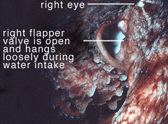 The process of jet propulsion in an octopus is presented in simplified form in Figs. 1 - 2. The process is the same whether the animal is simply ventilating its ctenidia (gills) for gas exchange or whether it is jetting. There are two mantle openings, separated by the siphon. The openings are closed by flapper valves that pop into place during exhalation, thus forcing all the water out the siphon. Correct alignment of the two mantle-cavity openings (Fig. 3) in relation to the siphon is ensured by symmetrically placed cartilaginous locking devices, termed here flapper valves. Correct alignment ensures that the two flapper valves open and close without back-flow leakage during exhalation (Fig. 4). On entry into the mantle cavity the two flows irrigate the paired ctenidia , and then before exiting the now single flow picks up fecal discharge from the anus, urine from the nephridiopores, and ink from the ink sac. Massive contraction of mantle musculature creates a propulsive jet from the siphon, that can be oriented in any direction.