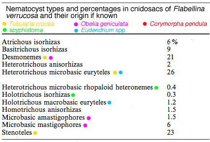 NOTE1 according to the author the nematocyst complements in the two genera of hydroids are mutually exclusive, and thus present a range of nematocysts (at least 9 different types) from which Flabellina can choose