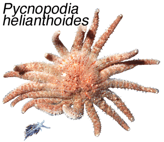 Fig. 1. While sunflower stars Pycnopodia helianthoides are known to rear back defensively from contact with many different types of cnidarians, such a response to the tiny nudibranch Hermissenda crassicornis has not yet been observed (the photograph you see here has, of course, been "staged")