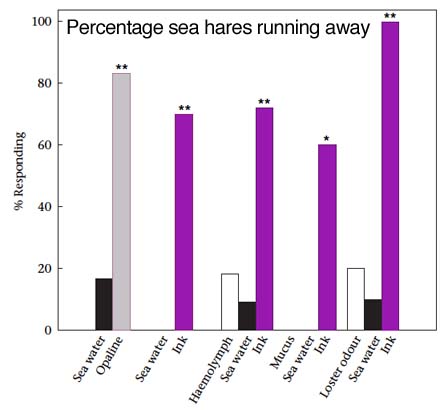 Fig. 1. Escape responses of sea hares Aplysia californica to various secretions and fluids. Sea-hare ink is purple, while opaline secretion, in species that have it, is grey. Absence of bars in the histogram indicate no response. Asterisks indicate significant difference from seawater controls, incuded as part of each test. Other test solutions used are hemolymph, mucus, and lobster odour