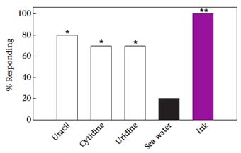 Like many other gastropods, the sea hare Aplysia californica will run from predators or from the scent of alarm chemicals such as ink and opaline secretions remaining behind after a conspecific is damaged or killed. The escape crawling can be quite quick, and often takes the form of a lively “galloping”. While both ink and opaline secretion willl evoke the alarm response, other conspecific fluids such as mucus or hemolymph will not, nor will odours from known predators such as spiny lobsters (Fig. 1). The active components of ink and opaline secretion have been identified by researchers in Maryland and Georgia as the base uracil and the nucleosides uridine and cytidine (Fig. 2). Each molecule alone will elicit a full escape response, while ink without these molecules will not. All three molecules are highly polar and, of course, water soluble. Interestingly, ink from congenor sea hares A. juliana and A. dactylomela, and ink from certain squids and octopuses, also contain uracil and uridine, and all elicit escape behaviours in A. californica. The authors suggest a common evolutionary selection for these chemicals in these distantly related molluscan species.