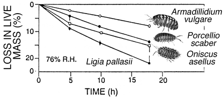A study on four oniscid species in British Columbia, including the semiterrestrial Ligia pallasii, shows that overall resistance to drying at 76% RH follows the order L. pallasii < Oniscus asellus < Porcellio scaber < Armadillidium vulgare, which corresponds with the degree of exoskeleton permeability and matches the accepted order of increasing terrestriality (Fig. 1). Providing that losses are less than about 25% over a period of a few hours, all species rehydrate quickly when returned to moist conditions. During feeding and other excursions Ligia pallasii commonly dips its uropods or last pair of appendages into puddles, with the tips pressed together (Fig. 2). The water is conducted by capillary action along the juxtaposed appendages into the gas-exchange areas and into the brood chambers of females.