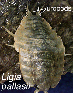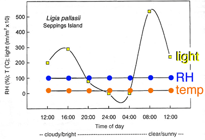 The sea slater Ligia pallasii in British Columbia occupies supralittoral rock-crevice or tumbled-rock habitats extending vertically only 1 - 2m above the high-water mark. At one boulder/cobble site in Barkley Sound (Seppings Island) in situ