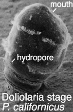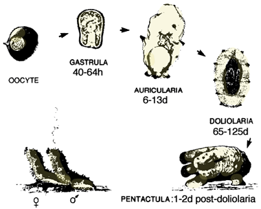 In laboratory culture of eggs of Apostichopus californicus (Fig. 1) a blastula stage is reached after 24h, a hatched gastrula by 64h, and a feeding auricularia larva after 13d (at 10 - 12°C). Metamorphosis is of a gradual kind, first to a doliolaria stage occurring at 65 - 125d, and then to a pentacula stage occurring 1 - 2d later (Fig. 2). The early pentacula remains pelagic at first, but then, as more adult features develop, settles to the sea bottom. The young pentacula can crawl about using its tube feet and tentacles. Sexual maturity is attained after about 4yr in field populations. In comparison with most other echinoderms this seems a long time.