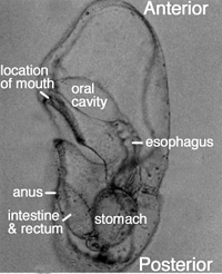 Fig. 1. Auricularia larva of Apostichopus californicus showing features of the gut system. The author shows the mouth to be at the opening to the oral cavity, but in other reports it is shown as being within the oral cavity at the anterior end of the esophagus. The larva is about 400µm in length