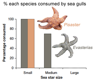 As part of a general survey of habitats occupied by Pisaster ochraceus and Evasterias troschelii in Puget Sound, Washington researchers from Friday Harbor Laboratories document predation on both species by gulls Larus spp. Smaller sizes of both prey species are generally preferred, likely explained by the fact that the gulls find pecking bits from a sea star less preferable than swallowing them whole (Fig. 1). Note that only small-sized Pisaster are eaten and no large individuals of either species are eaten. The gulls prefer Evasterias over Pisaster (88% vs. 12%, respectively) possibly owing to its generally less bulky shape and to the fact that Evasterias anchors by its tube feet significantly less securely than Pisaster (Fig. 2). These data show that Pisaster attaches with 1.3 times greater strength than Evasterias. With respect to habitats occupied, there is an ontogenetic shift in preference, with the smaller more vulnerable sizes of both species favouring crevice microhabitats possibly for predation refuge. As the sea stars become larger and enter size refuge (from gull predation?), they tend to move out into open areas such as rocks or pilings and docks, with less structural complexity, but more abundant and larger food resources in the form of barnacles and mussels.