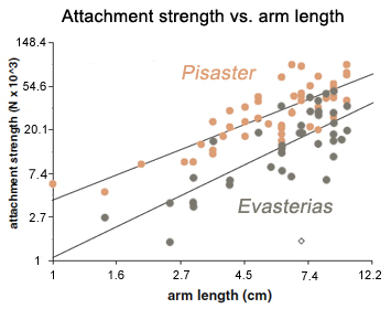 NOTE anchoring force is assessed using a cable tie attached at the base of one arm and a spring balance. The data in Fig. 2 are presented as antilog equivalents of the natural log values used originally by the authors, for visual clarity (thus explaining why they are not whole numbers). However, other than to spread out the data, it is not clear why the authors choose to graph the data logarithmically. Because attachment strength depends on tube-foot number, and thus directly on arm length, then the relationship would be expected to be linear. No transformation would be necessary for a straight-line relationship. This unnecessary transformation does not at all affect the validity of the data