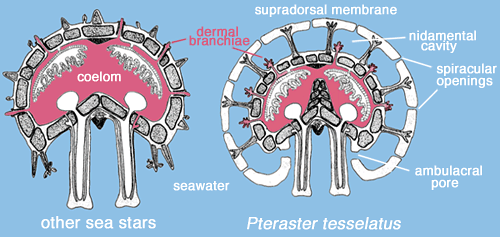 NOTE when Patiria is not in defensive mode, it pumps seawater through the nidamental cavities at a rate of 3 - 4 volumes . min-1 (at 10oC) to enable gas exchange. Note in the drawings that, rather than projecting into the outside seawater as in other asteroids, the dermal branchiae in Pteraster project into the nidamental cavities. In both cases the dermal branchiae are expanded and contracted by hydraulic pressure changes in the coelomic cavity to which they are connected. Seawater for gas exchange enters through openings termed ambulacral pores (Fig. 1) that line the ambulacral grooves of the arms, percolates through the nidamental cavities, and exits via the large aborally located osculum. Prior to this publication these pores had not been described